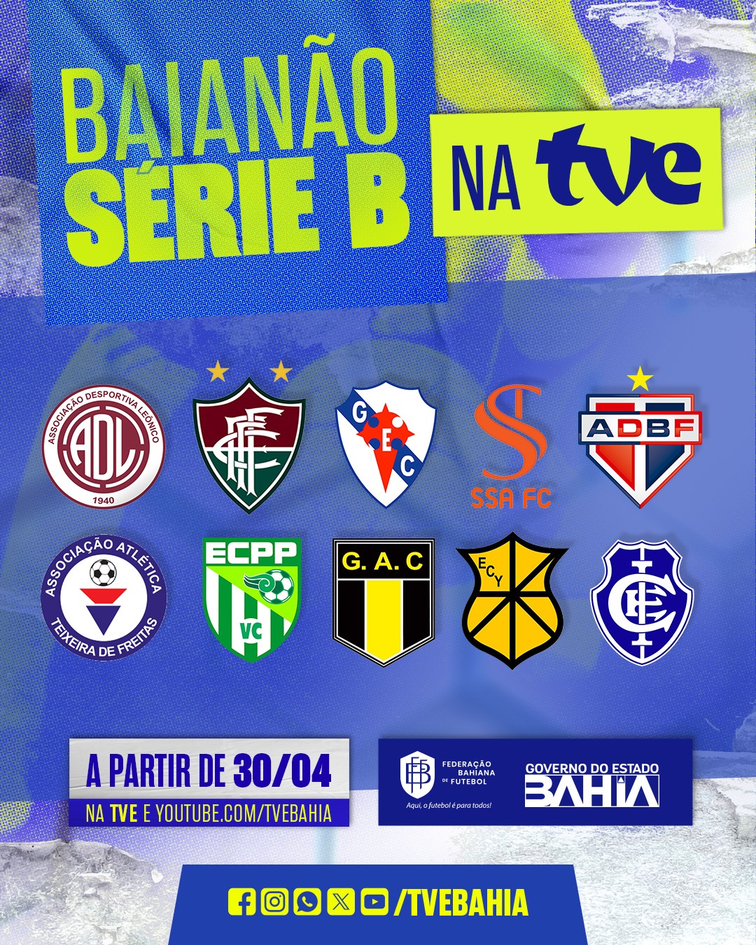Vai começar a disputa pelo Campeonato Baiano de Futebol Série B. A partir desta quarta-feira (30) a TVE inicia a transmissão exclusiva da competição, que reúne 10 times na disputa por duas vagas na elite do futebol baiano: Bahia de Feira, Fluminense, Galícia, Grapiúna, Itabuna, Leônico, SSA FC, Teixeira de Freitas, Vitória da Conquista e Ypiranga. Além da TV aberta, o confronto será transmitido pelo youtube.com/tvebahia.